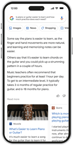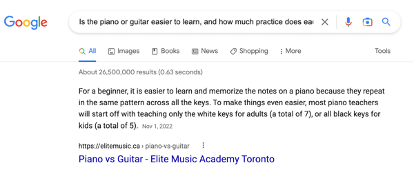 In the example Google provided, a user could search "Is the piano or guitar easier to learn, and how much practice does each need?"