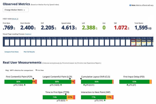 Scroll down, and you'll see a detailed breakdown of page performance. There's a visual page load timeline, a waterfall chart, videos of the page load, and an overview of core web vitals. The test even shows your results from each of the three times it loads your page during a test.