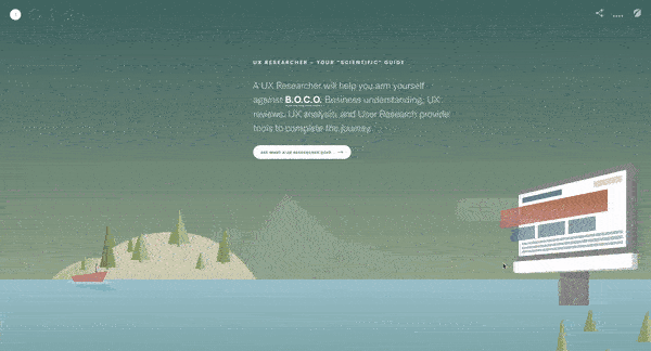 In their project titled “Defeat B.O.C.O,” the Fresh Consulting creative team takes you on a journey with a horizontal parallax scrolling design that also incorporates a vertical slide. As you move through the page, you’re effectively taken below the surface of the sea and invited to learn more about the UX design process. It’s a strong example because of its elegant storytelling, engaging visuals, and quirky animations.