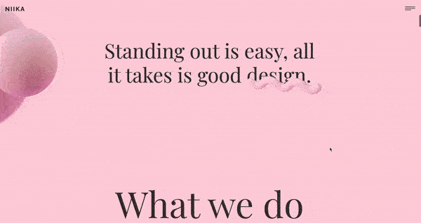 Niika’s mix of animation with the use of parallax scrolling creates an entrancing effect against a bright pink background. What’s most notable about this example is the use of diagonal animation under “What we do,” making the subheadings crisscross over each other as you scroll. This clever design makes it impossible to miss what the agency might do for you.